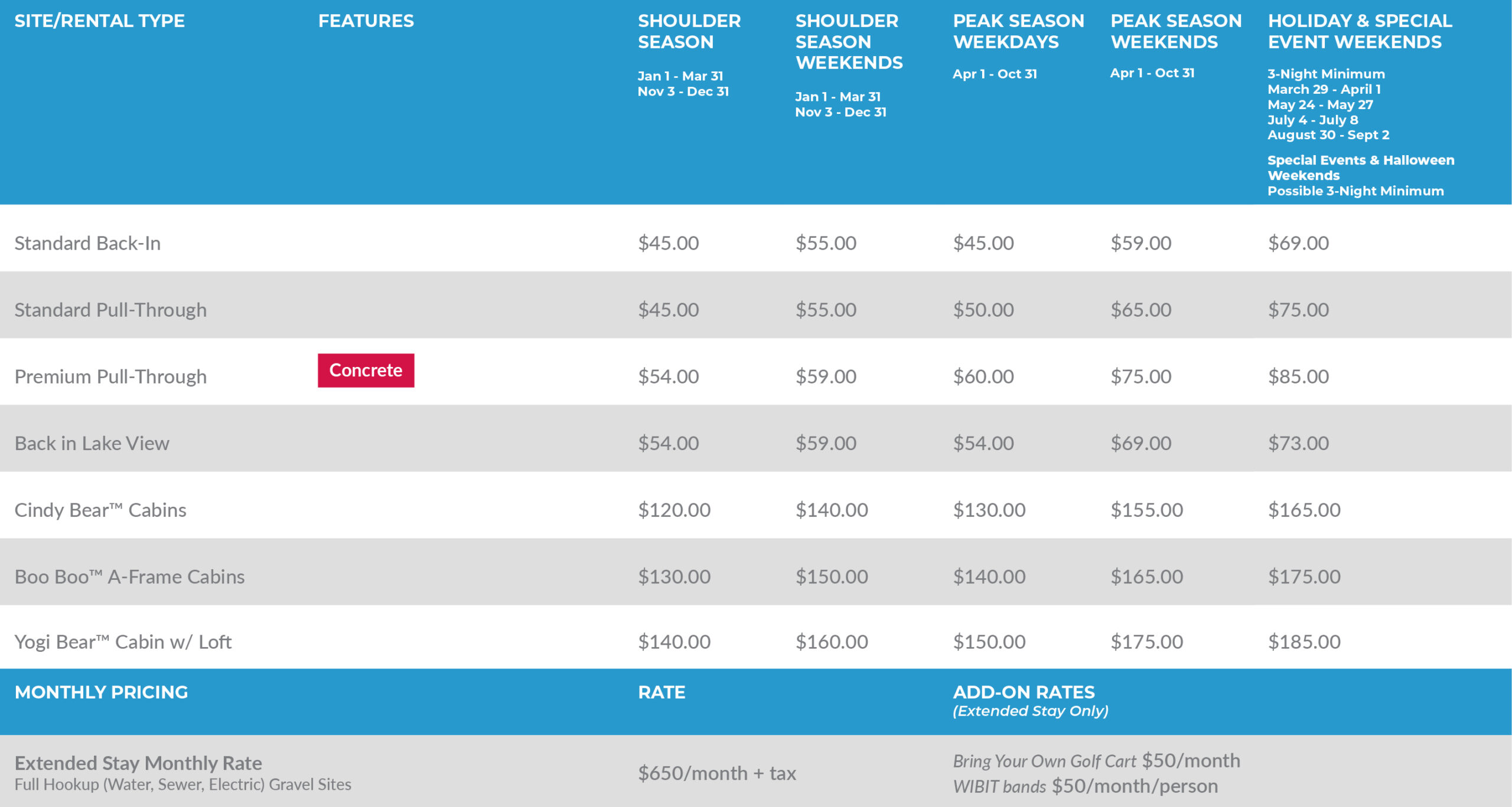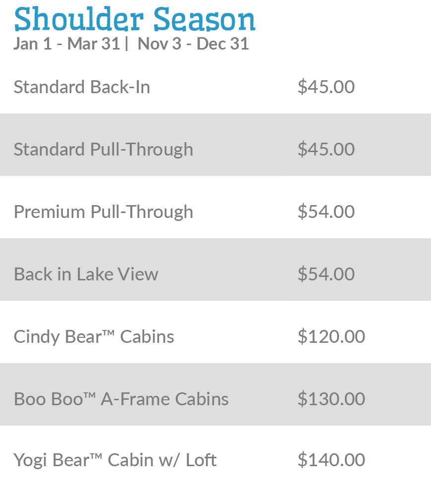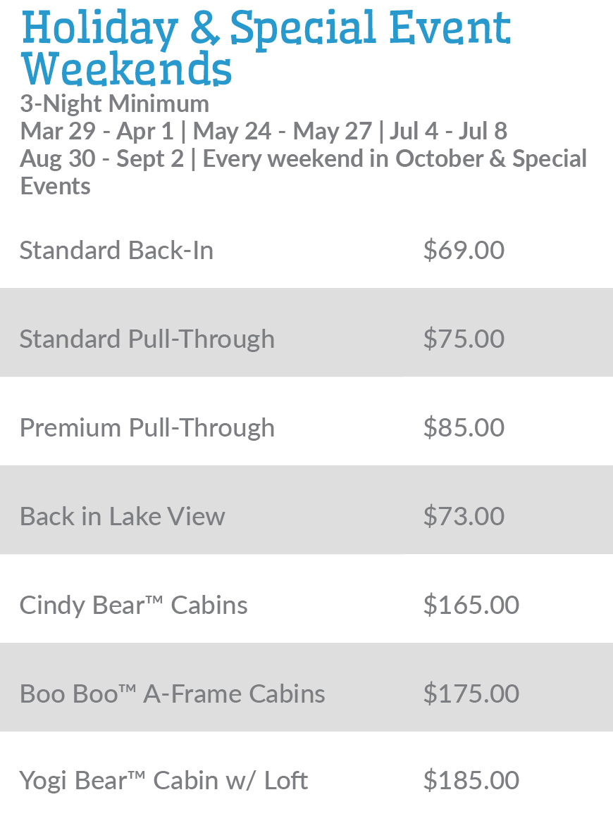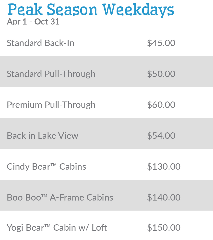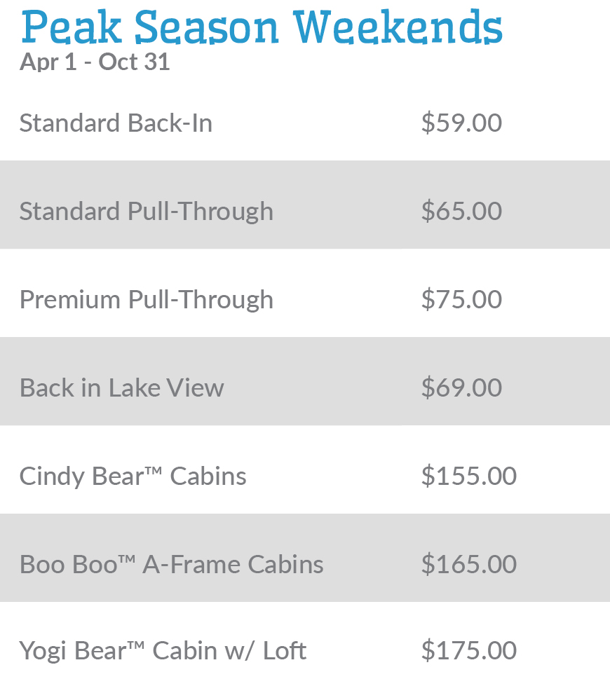 • Pets are allowed only in Yogi Loft Cabins and Cindy Bear Cabins.