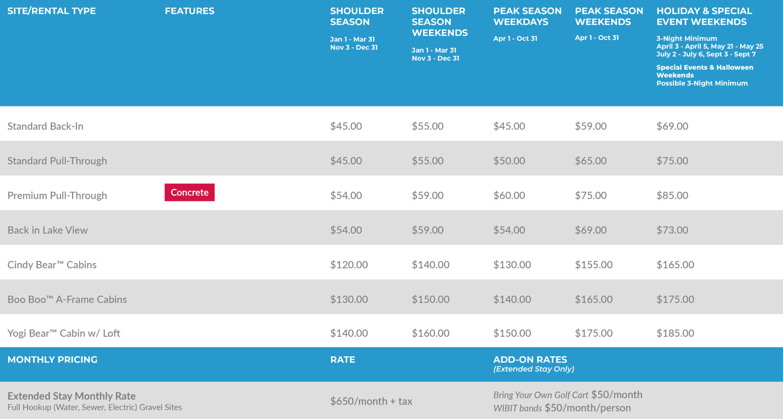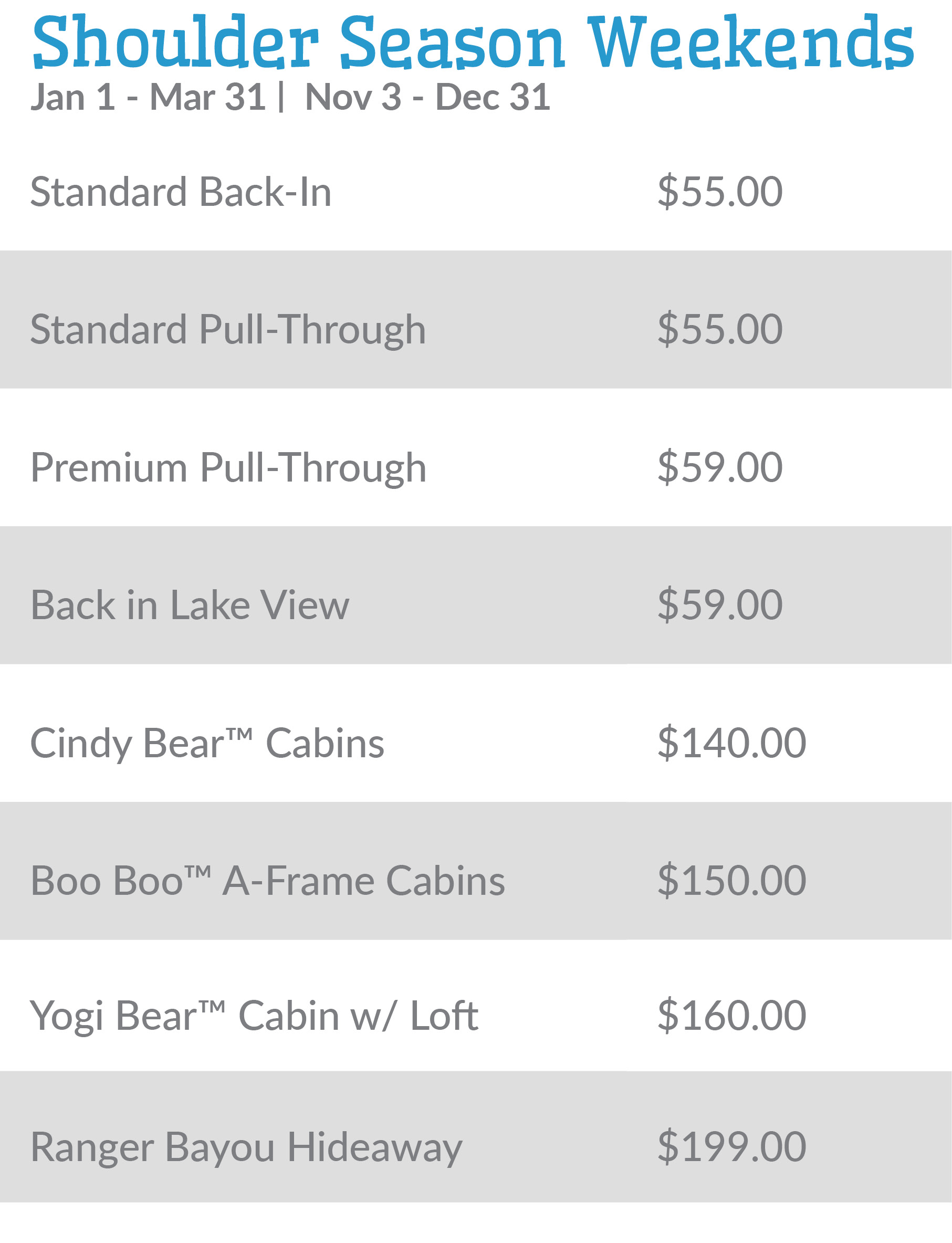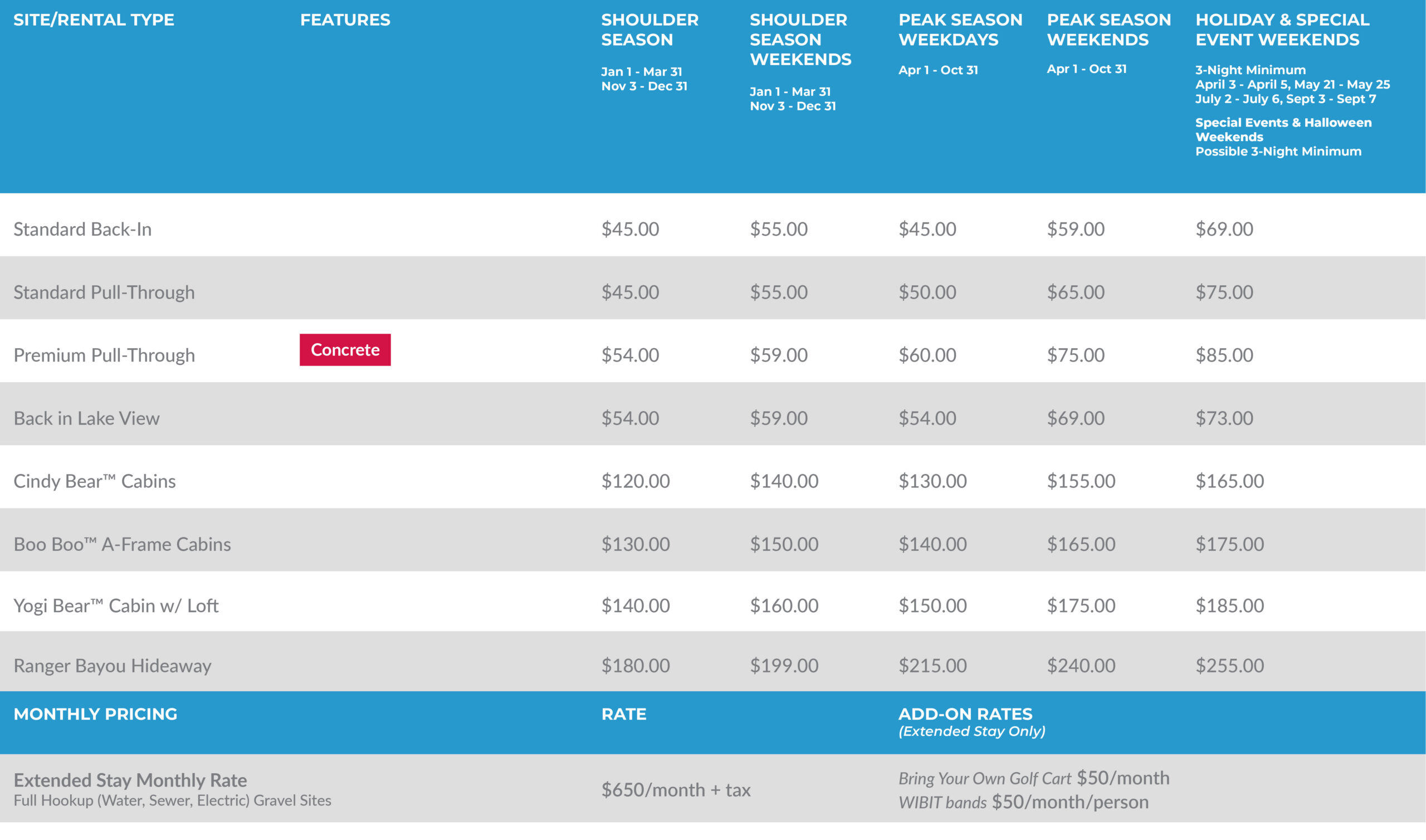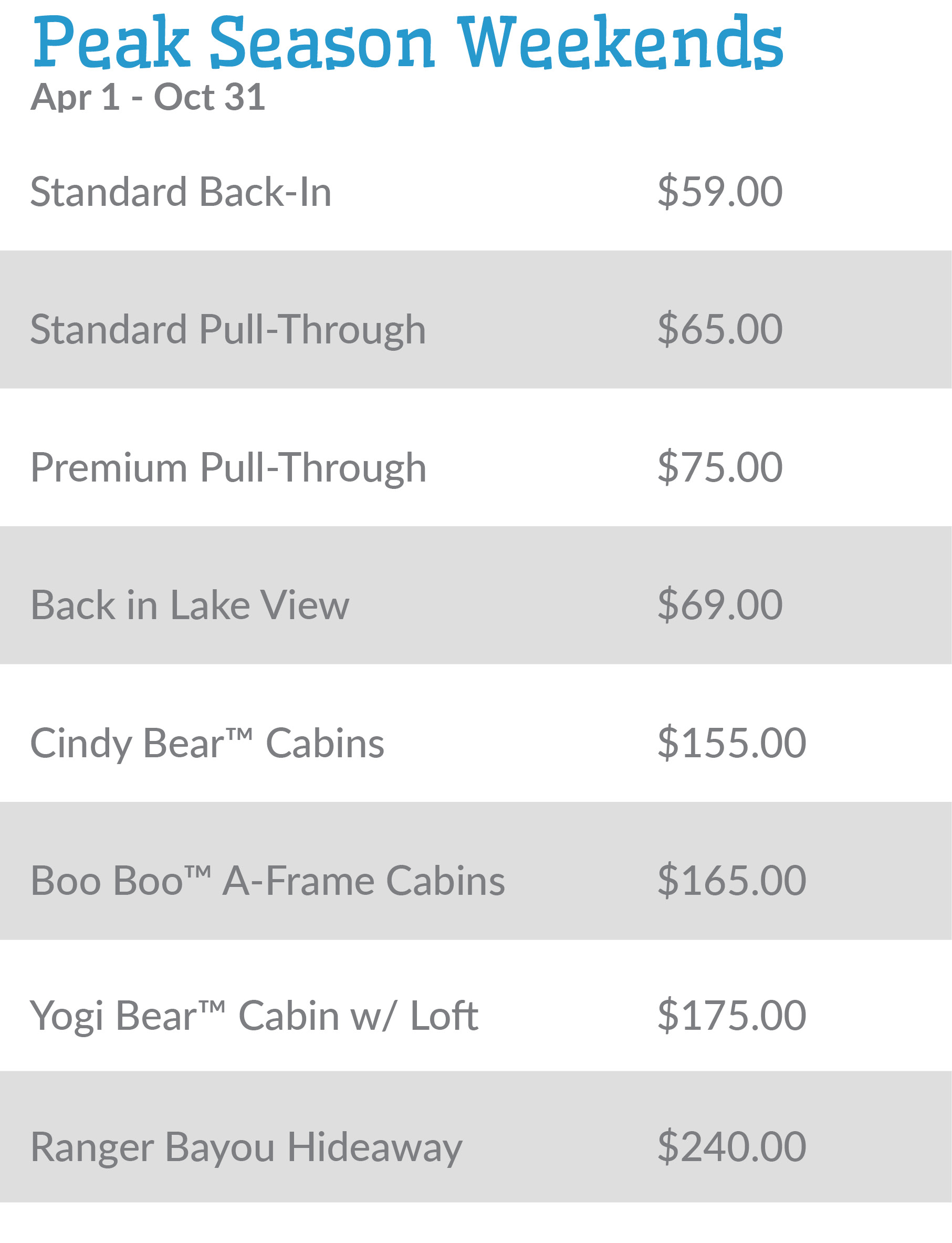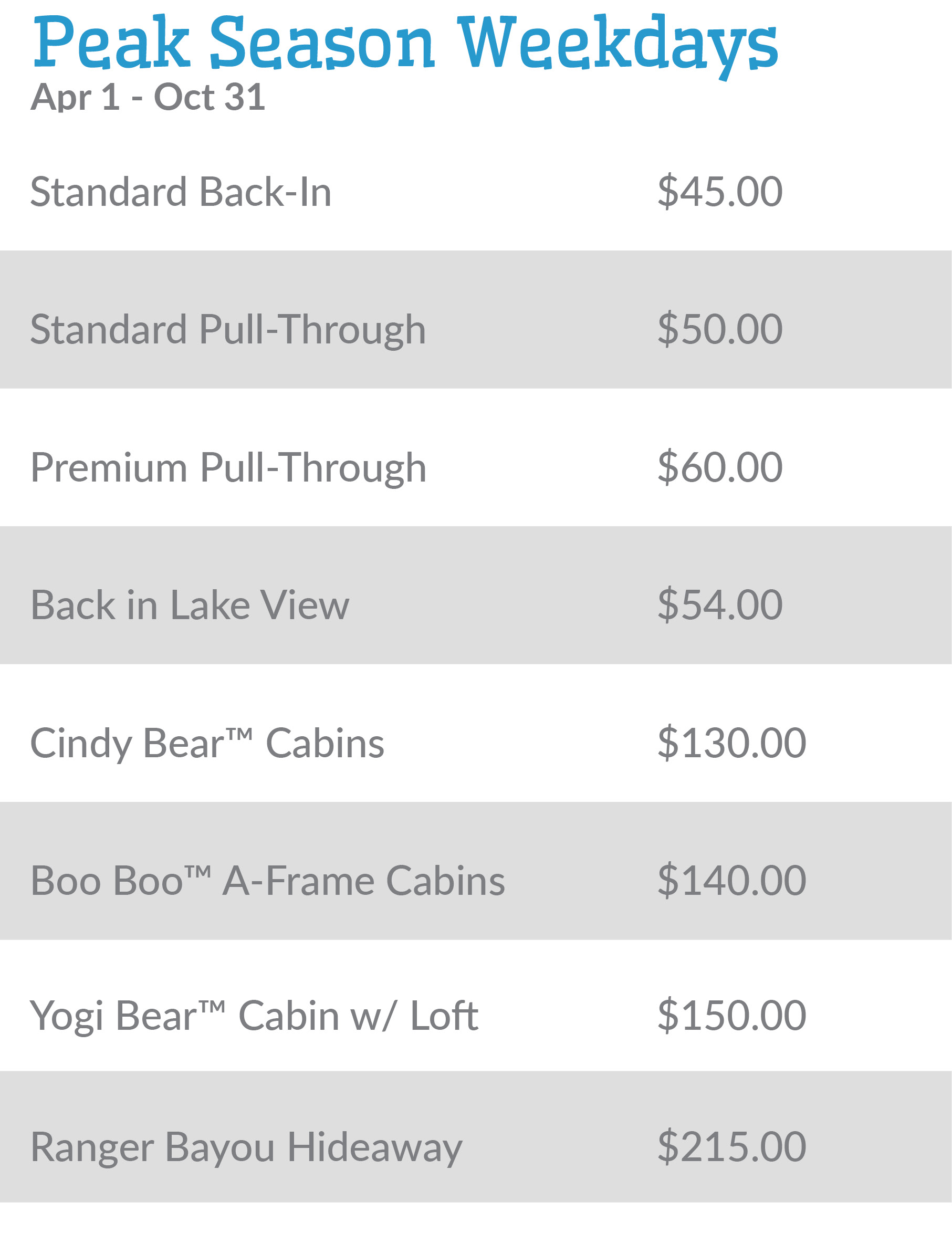 Weekday rates: Sunday through Thursday | Weekend rates: Friday & Saturday