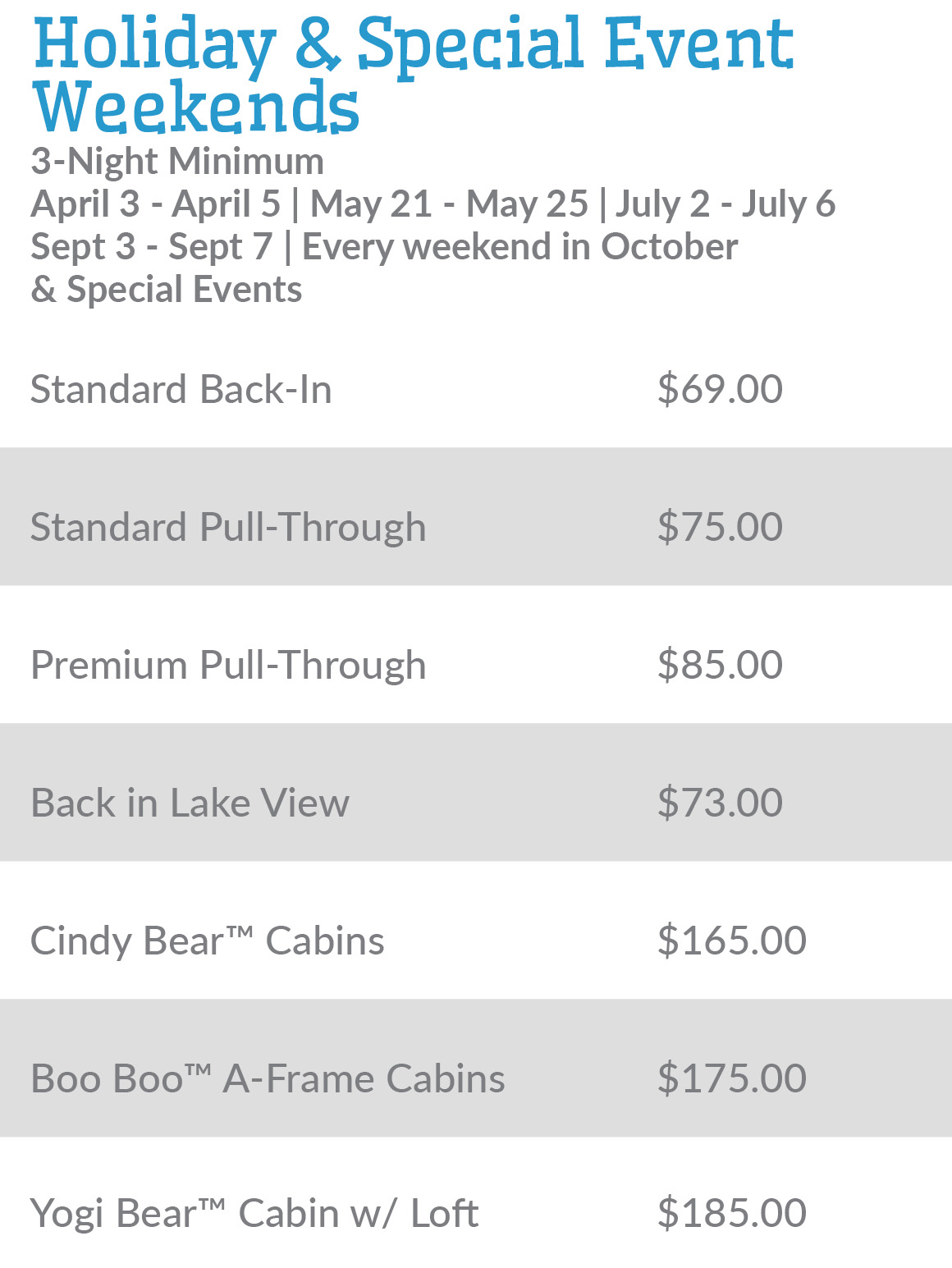 • Memorial Day Weekend – (May 23-26, 2025) – 3-night minimum