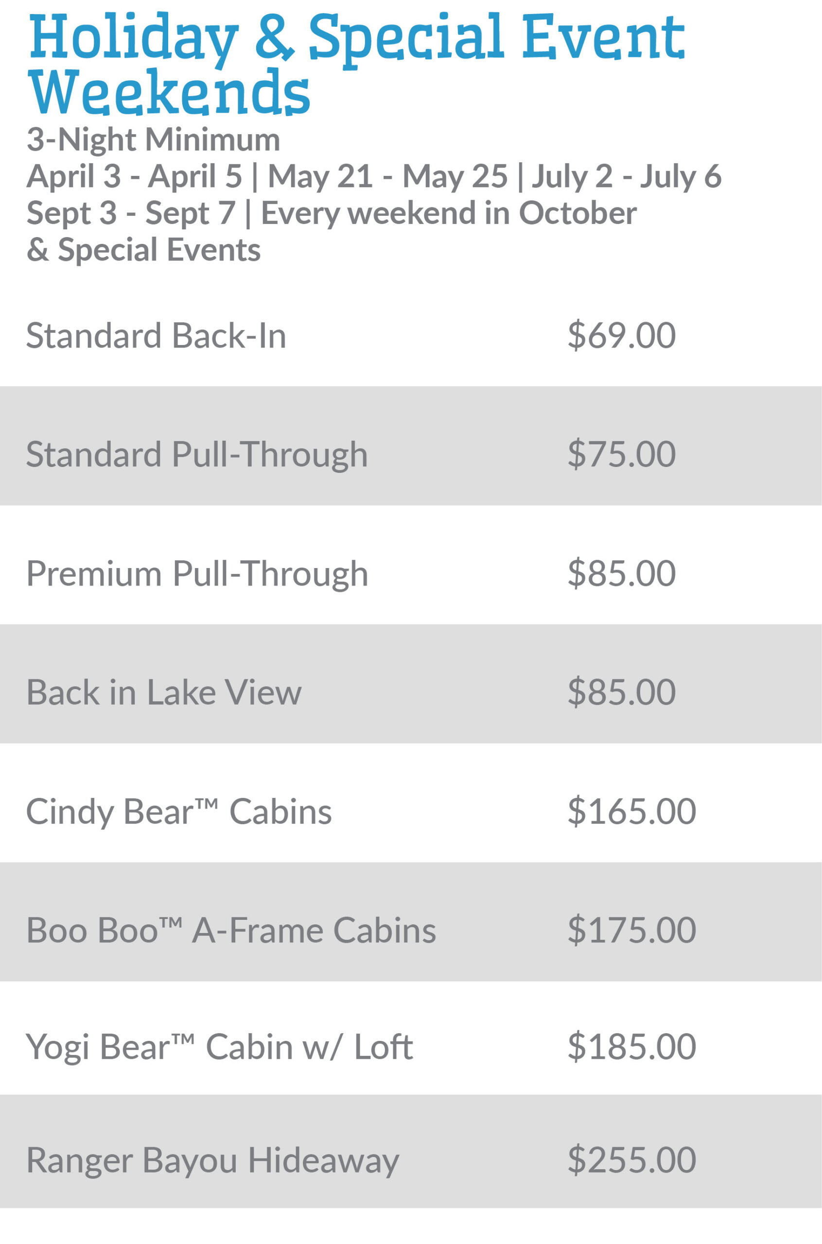 • 4th of July Holiday – (July 3-6, 2025) – 3-night minimum.