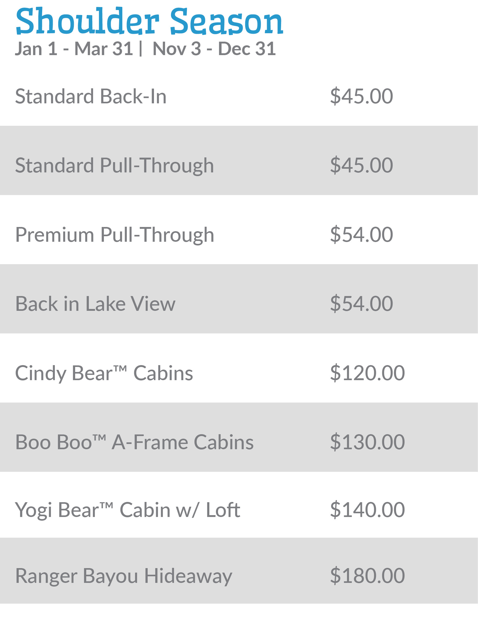 • Pet fee: $25.00 per pet. Maximum of 2 pets per cabin. Pet fee applies to CABINS ONLY.